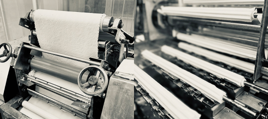 小麦粉の生地は、その日の気温や湿度によって水分量を細かく調整しています。シート状にした生地を重ね巻くことで、味しみが良くもちもち食感のちくわぶとなります。
